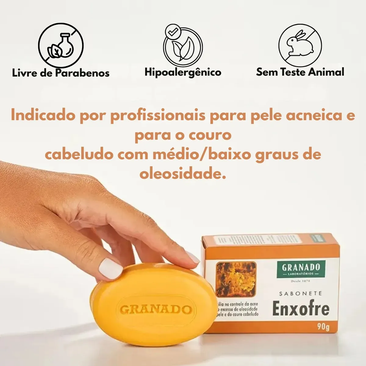 O sabonete em barra azufre granate contém 7% de enxofre e é ideal para limpar o rosto com acne e reduzir o excesso de oleosidade no couro cabeludo com teor médio ou baixo de óleo. Livre de parabenos e sem ingredientes de origem animal, aproveita as propriedades anti-inflamatórias, adstringentes e antibacterianas do enxofre para tratar a pele propensa à acne e reduzir a oleosidade. Sua fórmula inclui óleos vegetais e componentes que limpam suavemente. Aplica-se sobre a pele úmida, esfregando até formar espuma, e enxágua facilmente. Recomenda-se consultar dermatologista antes do uso. Uso externo que ajuda a manter a pele limpa, equilibrada e saudável, sendo uma opção natural e eficaz para cuidado facial e capilar.